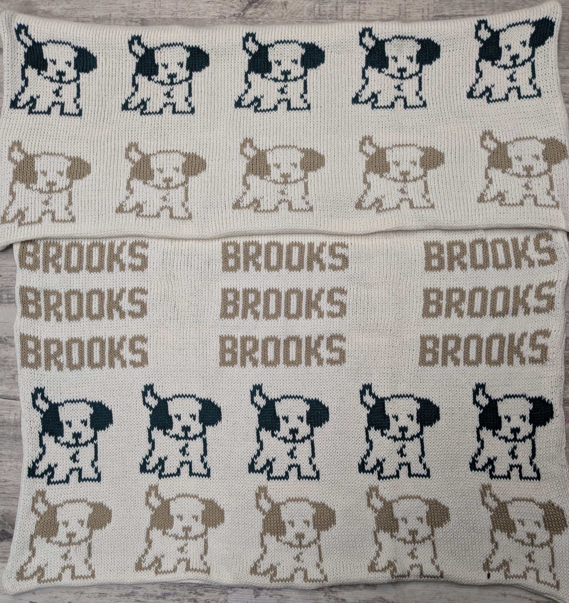 Puppy Many names blanket has your child’s name repeated with 2 rows of puppys across the bottom.
